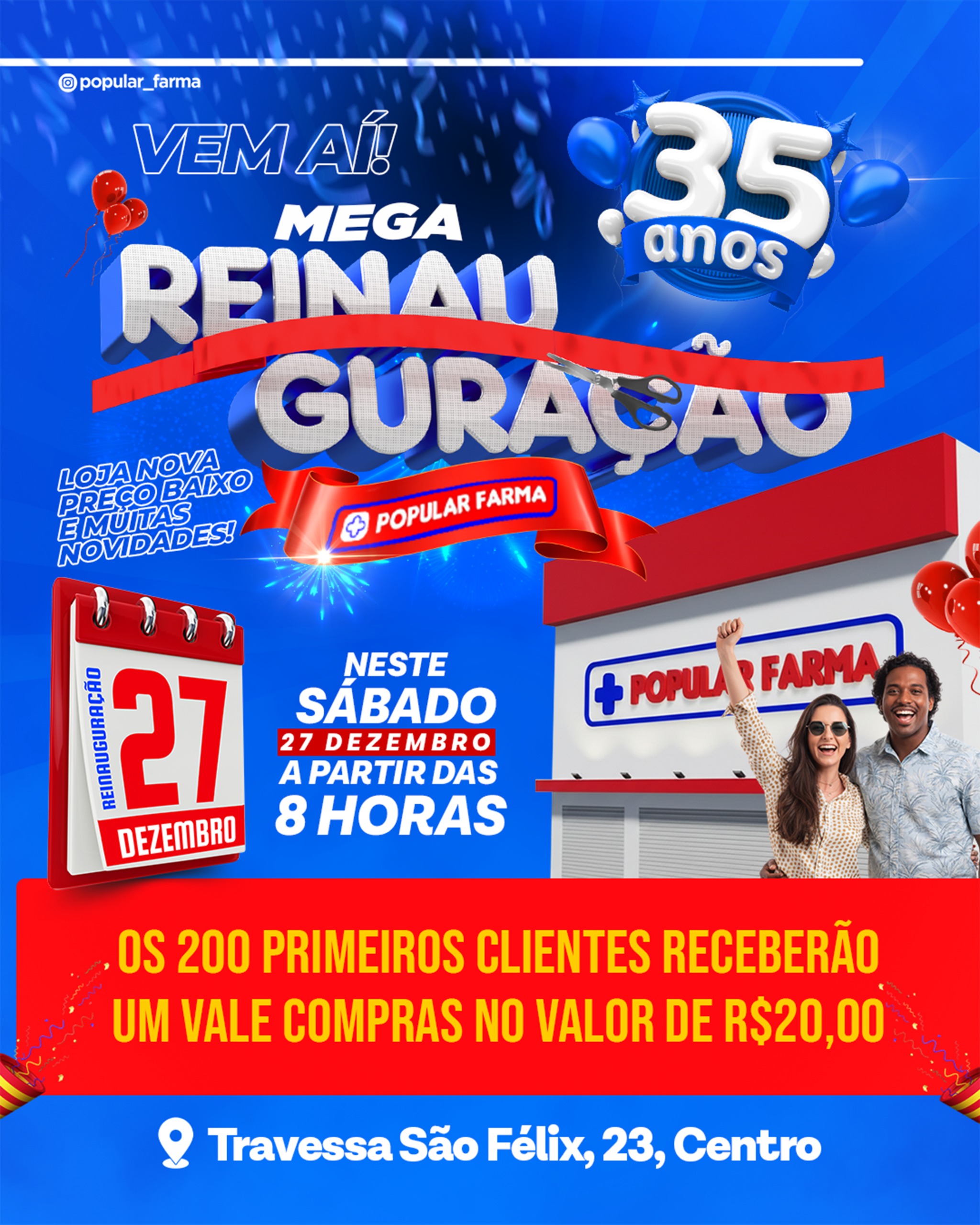 Os 200 primeiros clientes vão ganhar um vale-compras de R$ 20,00.Chegue cedo, traga a família e venha comemorar esse novo momento com a gente.